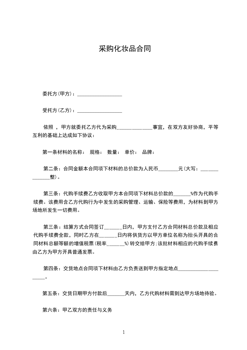 第三条:代购手续费乙方收取甲方本合同项下材料总价款的_______%作为代购手续费。该费用含乙方代购行为中发生的采购管理、运输、保险等费用,为材料到甲方场地所发生一切费用。