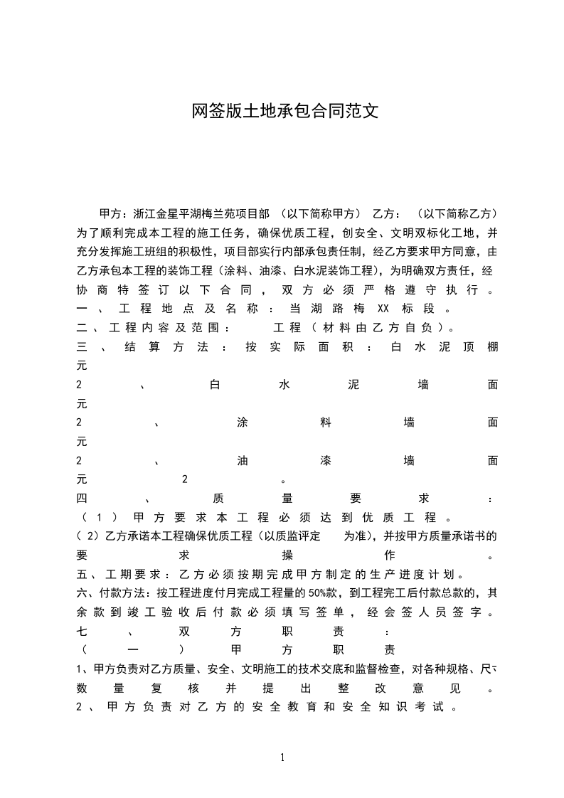 甲方:浙江金星平湖梅兰苑项目部 (以下简称甲方) 乙方: (以下简称乙方) 为了顺利完成本工程的施工任务,确保优质工程,创安全、文明双标化工地,并充分发挥施工班组的积极性,项目部实行内部承包责任制,经乙方要求甲方同意,由乙方承包本工程的装饰工程(涂料、油漆、白水泥装饰工程),为明确双方责任,经协商特签订以下合同,双方必须严格遵守执行。
