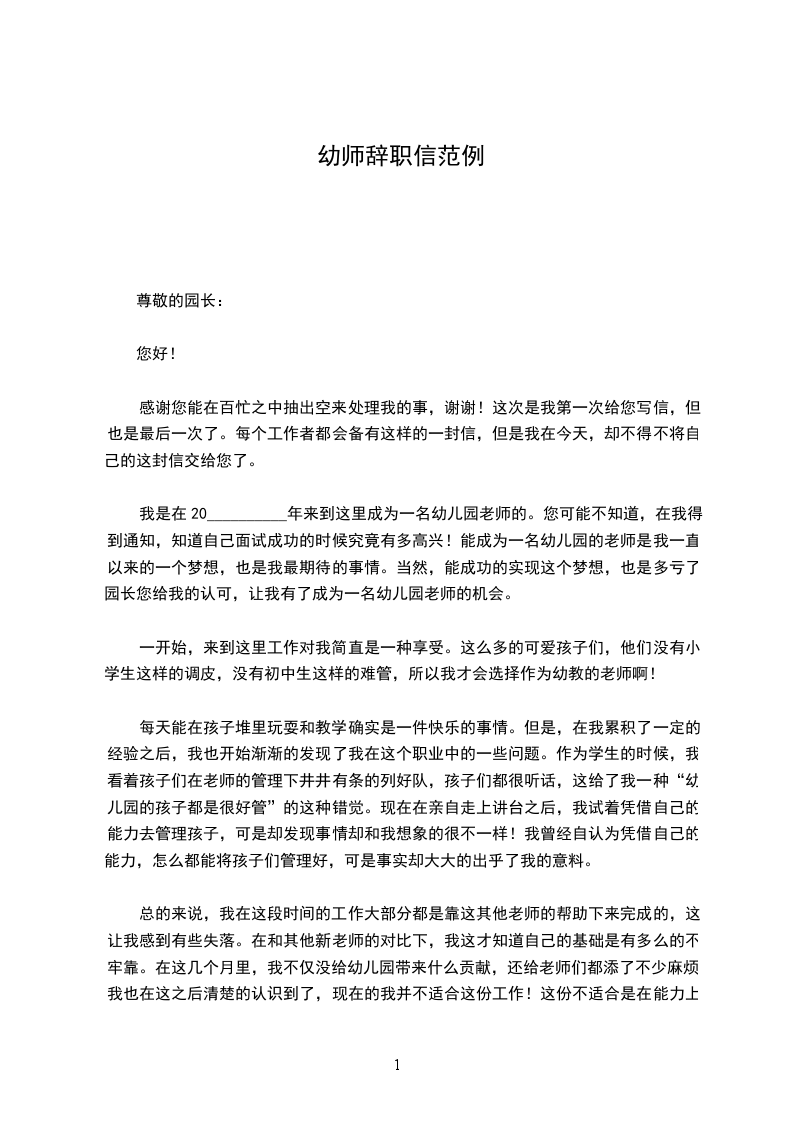 我是在20__________年来到这里成为一名幼儿园老师的。您可能不知道,在我得到通知,知道自己面试成功的时候究竟有多高兴!能成为一名幼儿园的老师是我一直以来的一个梦想,也是我最期待的事情。当然,能成功的实现这个梦想,也是多亏了园长您给我的认可,让我有了成为一名幼儿园老师的机会。