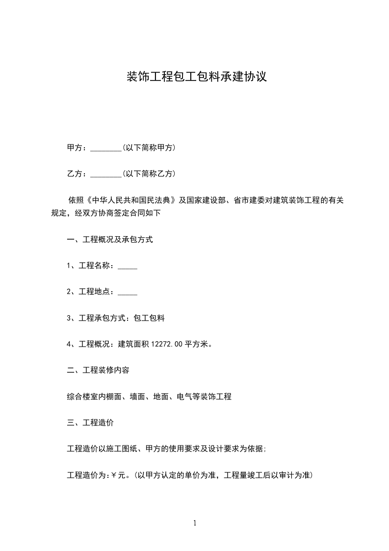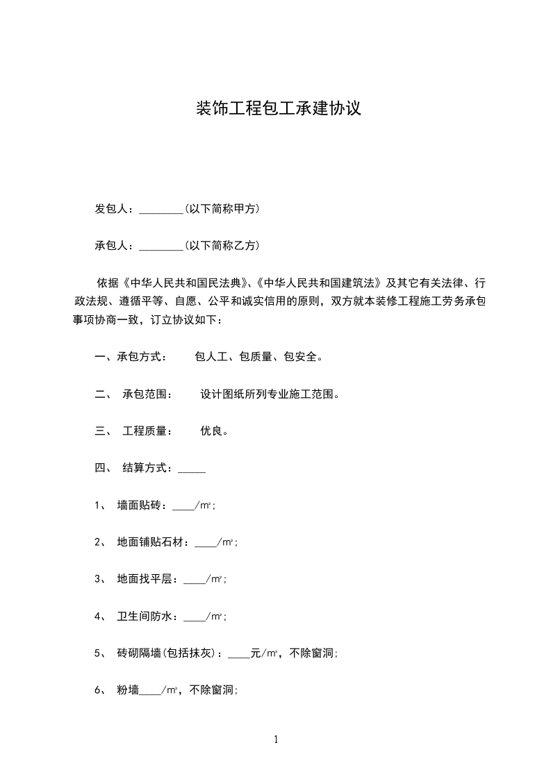 依据《中华人民共和国民法典》、《中华人民共和国建筑法》及其它有关法律、行政法规、遵循平等、自愿、公平和诚实信用的原则,双方就本装修工程施工劳务承包事项协商一致,订立协议如下: