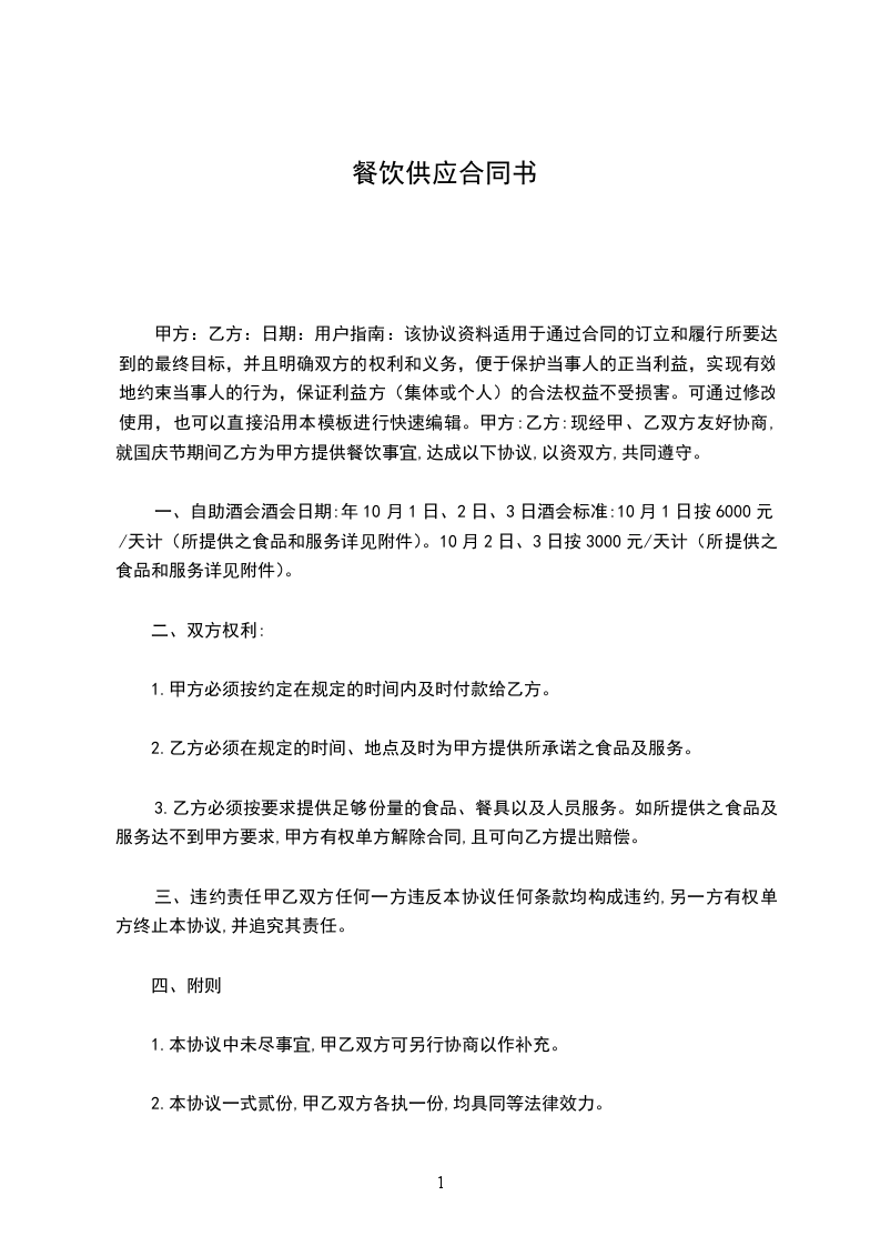 现经甲、乙双方友好协商,就国庆节期间乙方为甲方提供餐饮事宜,达成以下协议,以资双方,共同遵守。