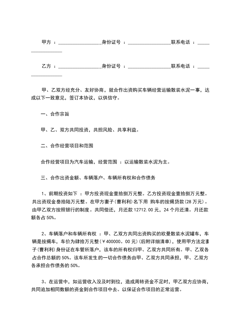 二、 该车总价37. 6万元(大写叁拾柒万陆千元),甲乙双方各出资一半即18. 8万元(大写壹拾捌万捌千元),利润、亏损平均分担。