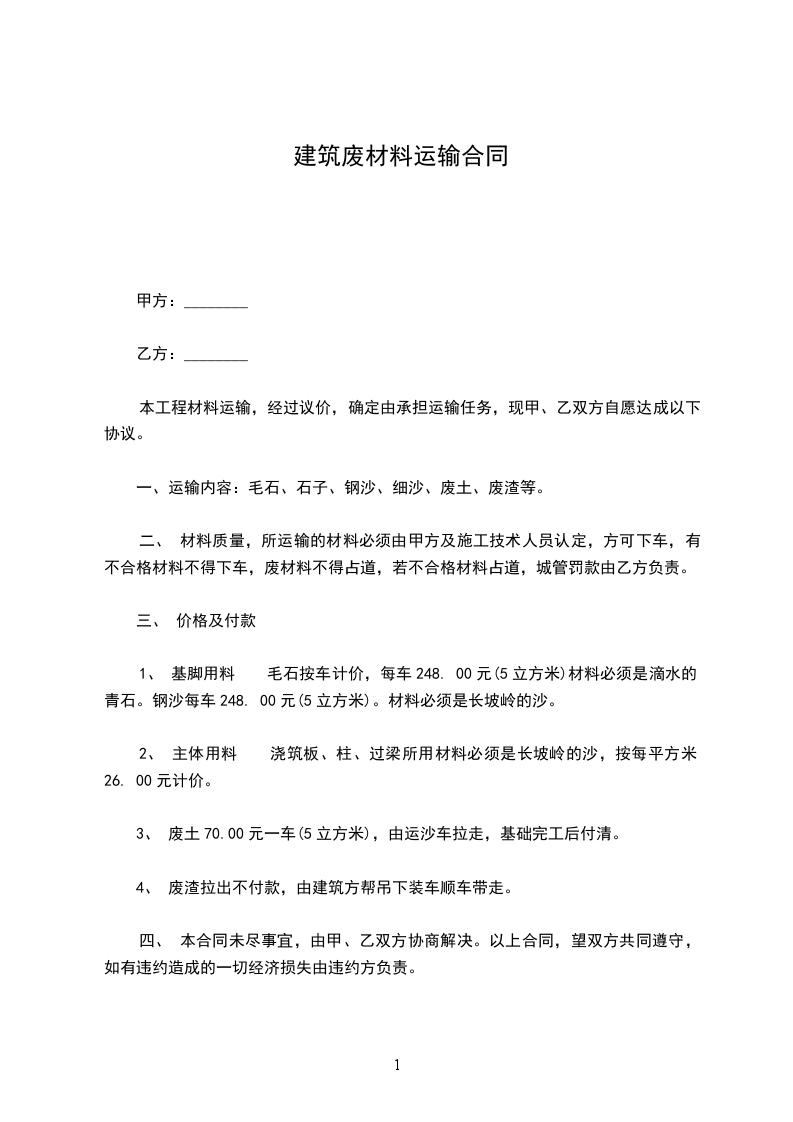 二、 材料质量,所运输的材料必须由甲方及施工技术人员认定,方可下车,有不合格材料不得下车,废材料不得占道,若不合格材料占道,城管罚款由乙方负责。