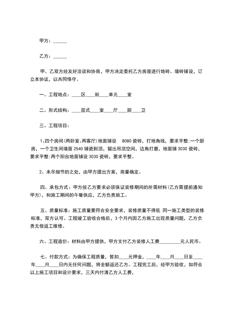 六、工程造价:材料由甲方提供,甲方支付乙方装修人工费_________元人民币。