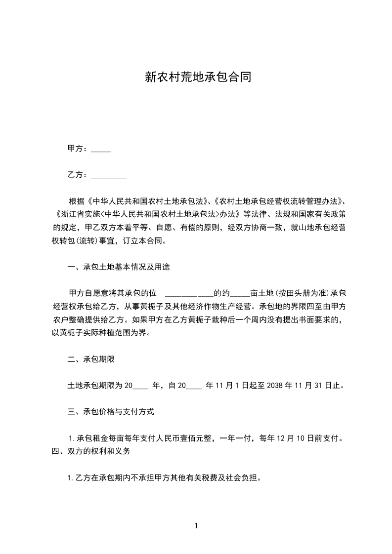 根据《中华人民共和国农村土地承包法》、《农村土地承包经营权流转管理办法》、《浙江省实施<中华人民共和国农村土地承包法>办法》等法律、法规和国家有关政策的规定,甲乙双方本着平等、自愿、有偿的原则,经双方协商一致,就山地承包经营权转包(流转)事宜,订立本合同。