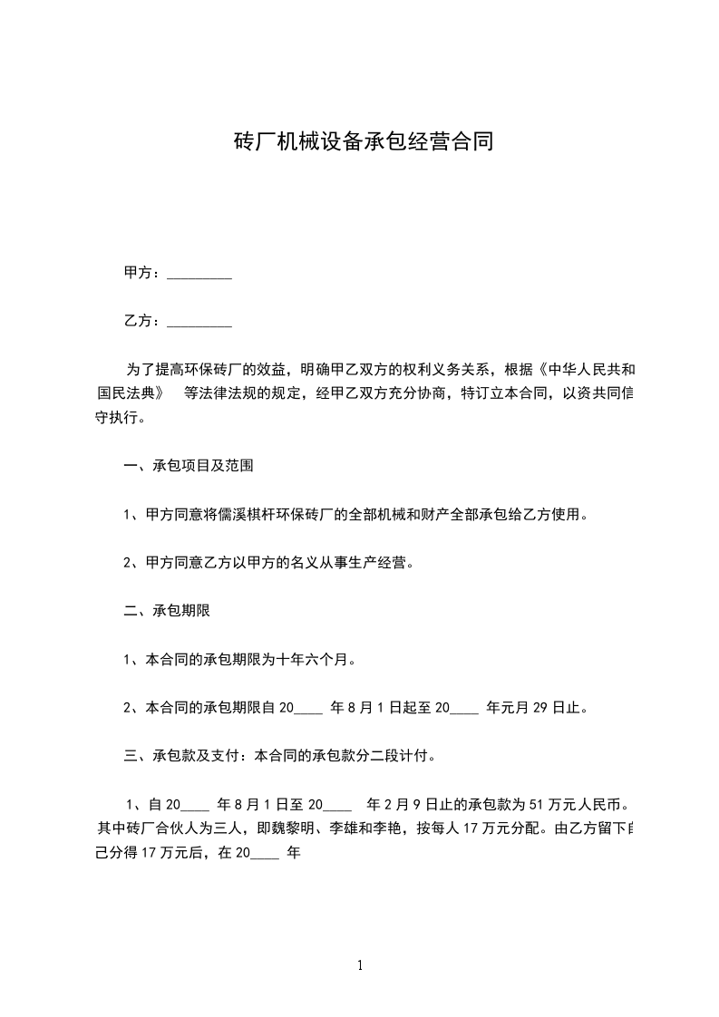 1、甲方同意将儒溪棋杆环保砖厂的全部机械和财产全部承包给乙方使用。