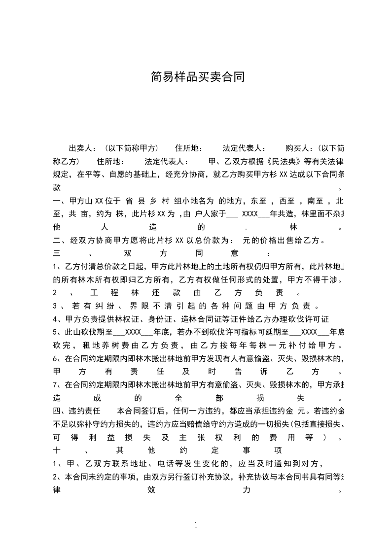 出卖人: (以下简称甲方) 住所地: 法定代表人: 购买人:(以下简称乙方) 住所地: 法定代表人: 甲、乙双方根据《民法典》等有关法律规定,在平等、自愿的基础上,经充分协商,就乙方购买甲方杉XX达成以下合同条款。