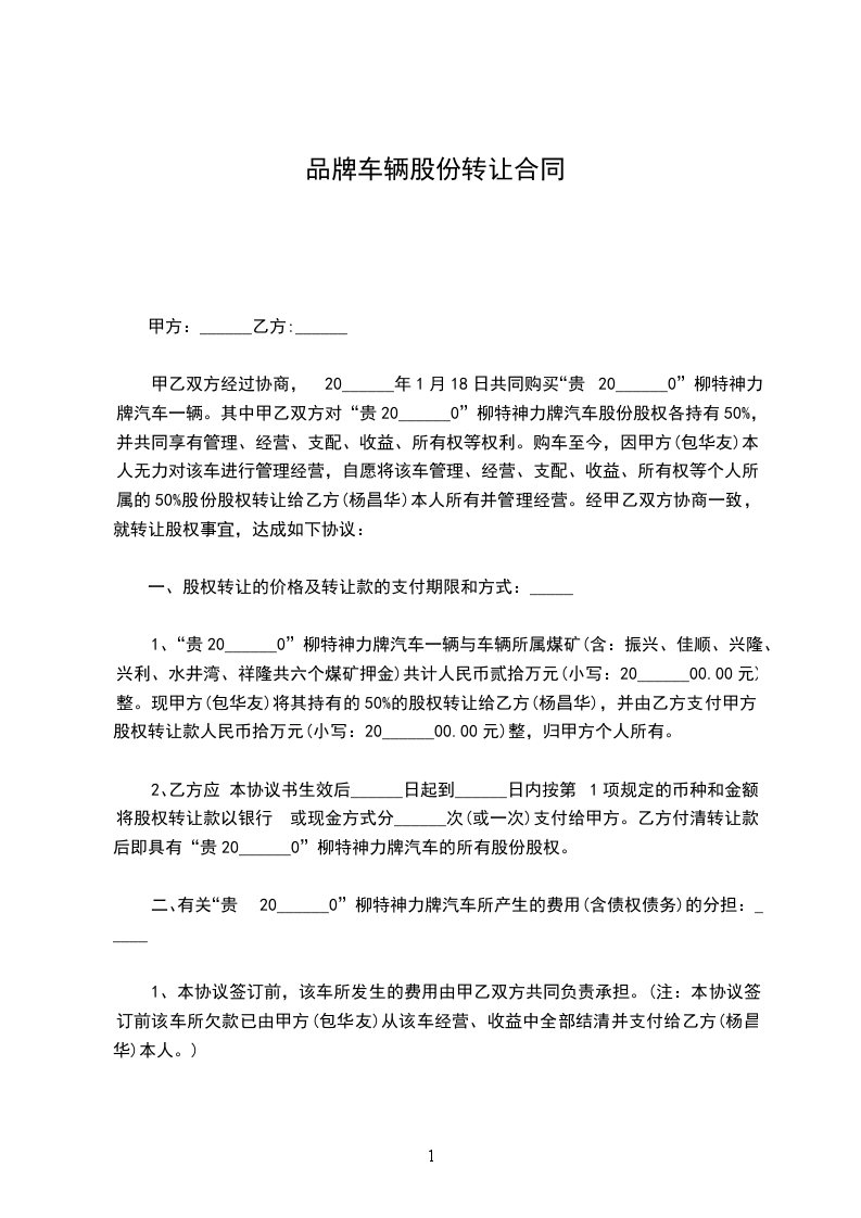 1、“贵20______0”柳特神力牌汽车一辆与车辆所属煤矿(含:振兴、佳顺、兴隆、兴利、水井湾、祥隆共六个煤矿押金)共计人民币贰拾万元(小写:20______00.00元)整。现甲方(包华友)将其持有的50%的股权转让给乙方(杨昌华),并由乙方支付甲方股权转让款人民币拾万元(小写:20______00.00元)整,归甲方个人所有。