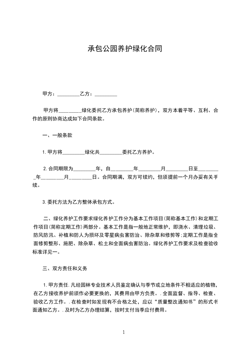 甲方将_________绿化委托乙方承包养护(简称养护),双方本着平等、互利、合作的原则协商达成如下合同条款。