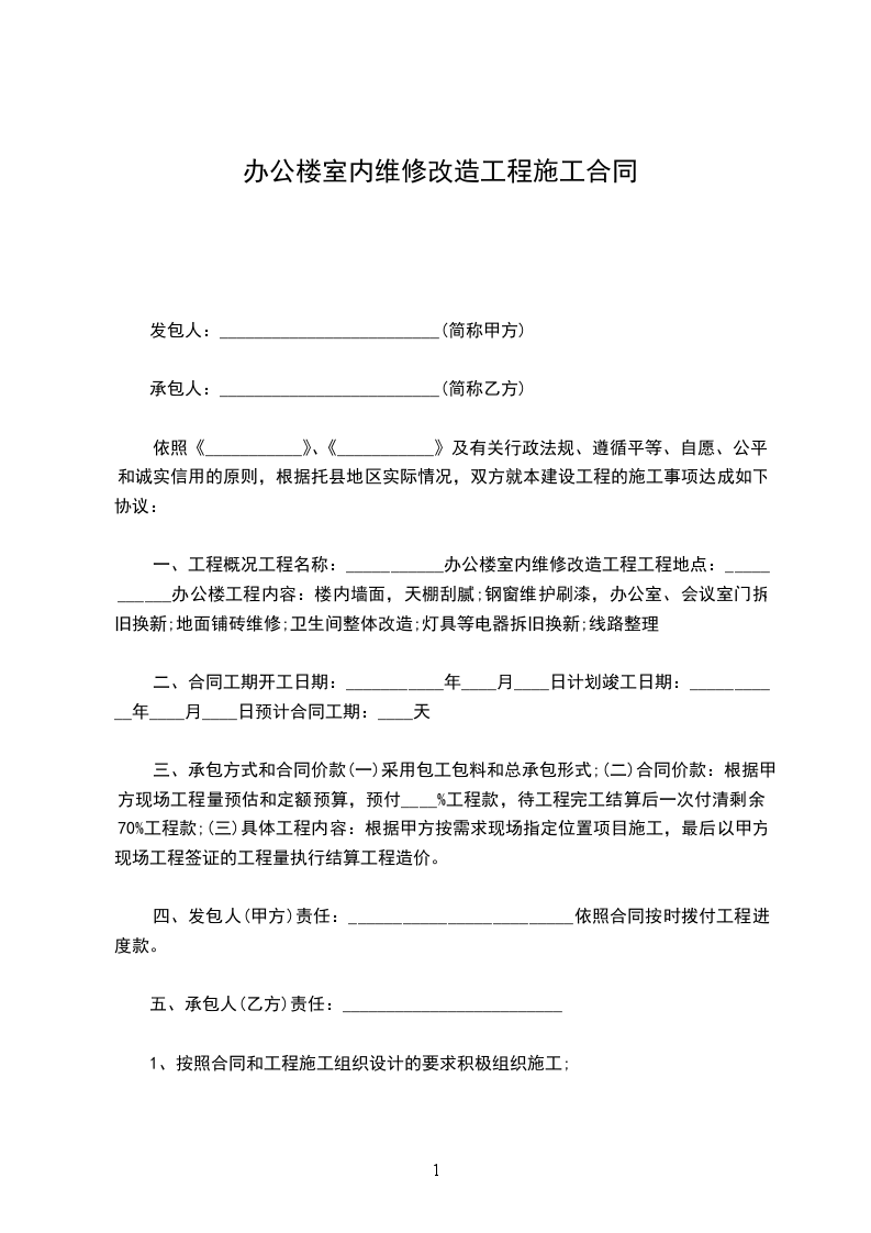 一、工程概况工程名称:___________办公楼室内维修改造工程工程地点:___________办公楼工程内容:楼内墙面,天棚刮腻;钢窗维护刷漆,办公室、会议室门拆旧换新;地面铺砖维修;卫生间整体改造;灯具等电器拆旧换新;线路整理
