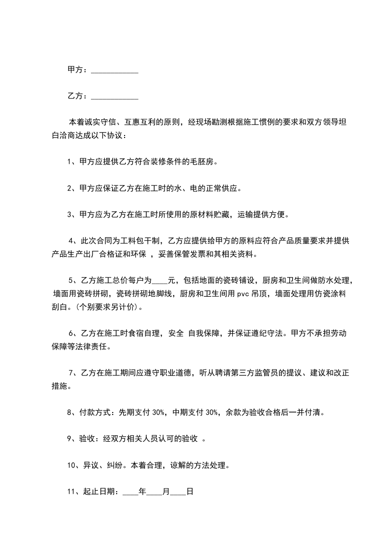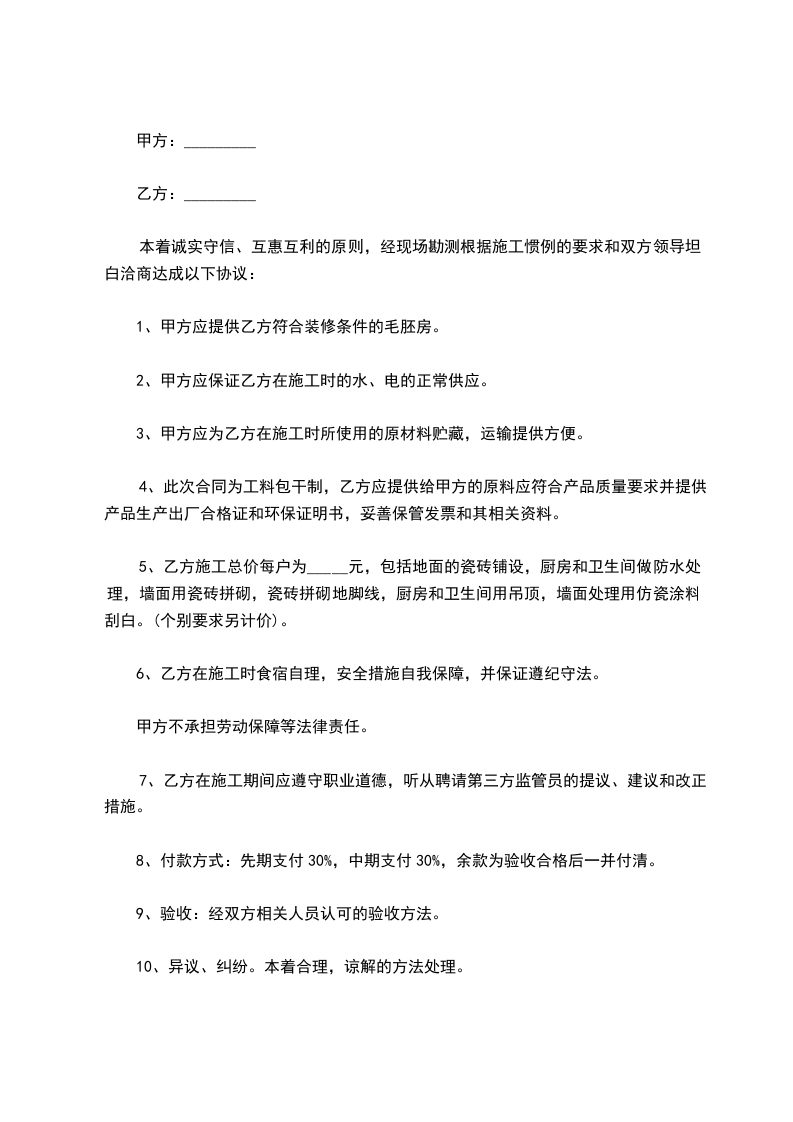 5、乙方施工总价每户为_____元,包括地面的瓷砖铺设,厨房和卫生间做防水处理,墙面用瓷砖拼砌,瓷砖拼砌地脚线,厨房和卫生间用吊顶,墙面处理用仿瓷涂料刮白。(个别要求另计价)。