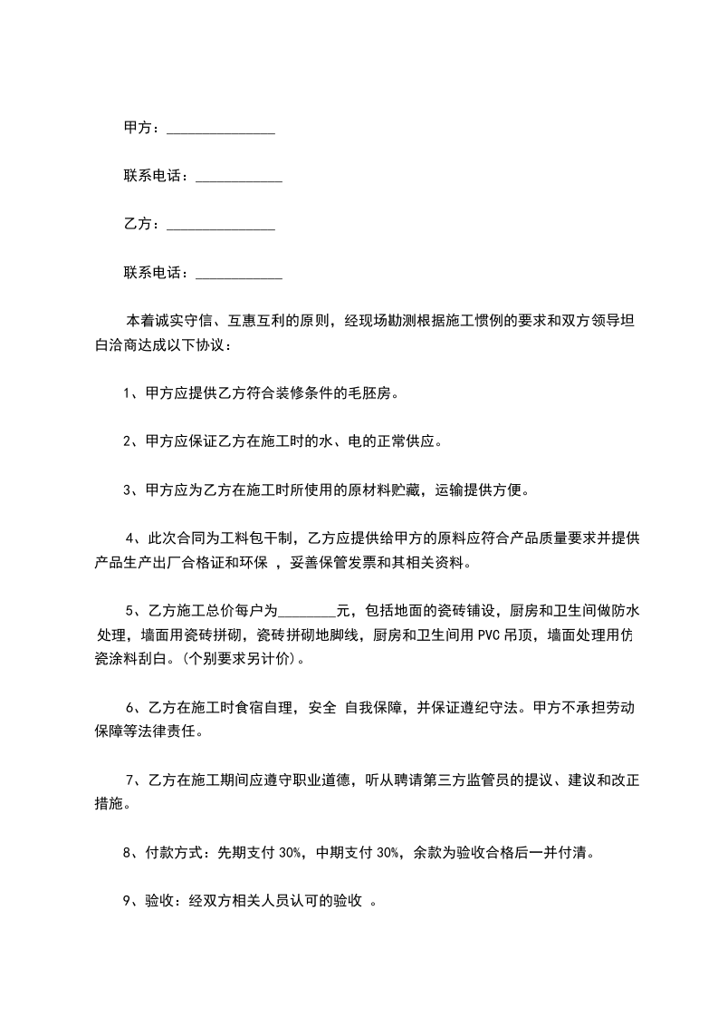 6、乙方在施工时食宿自理,安全措施自我保障,并保证遵纪守法。