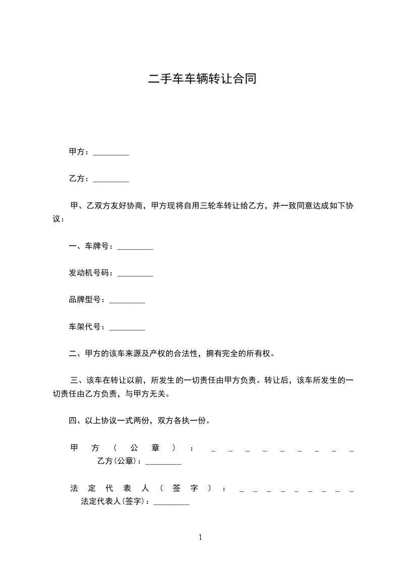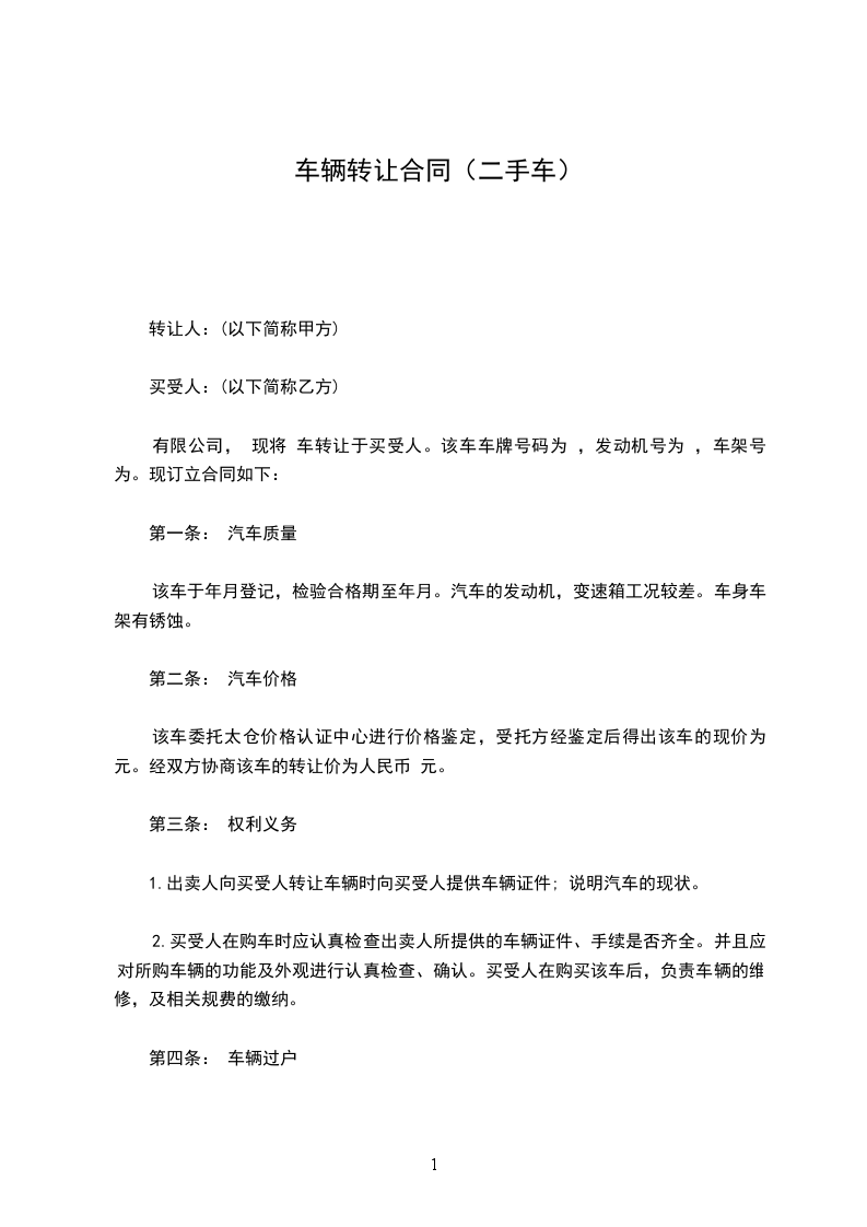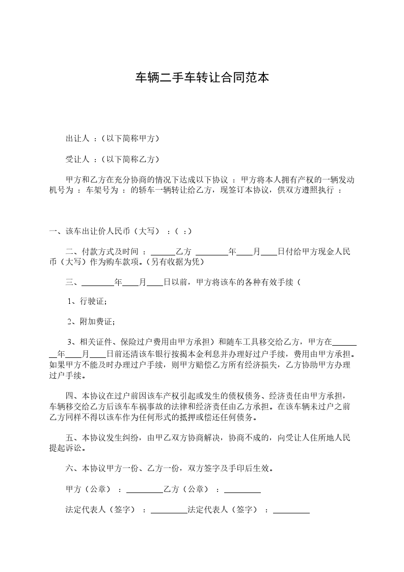 甲方_________现将___________车转让 乙方_________。该车车牌号为码为_________,发动机号为______________,车架号为______________________。现订立汽车转让合同如下