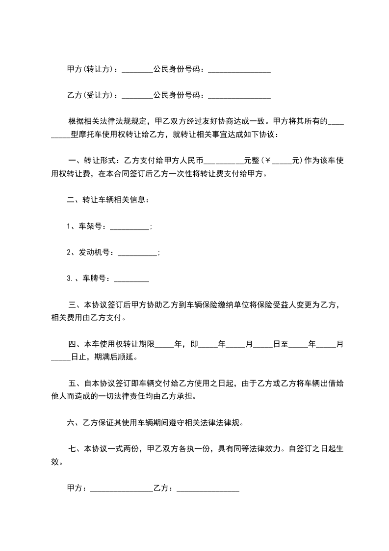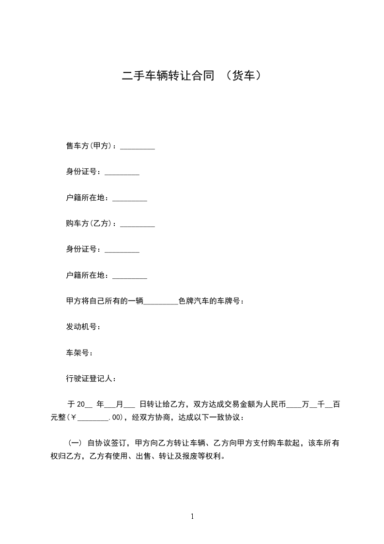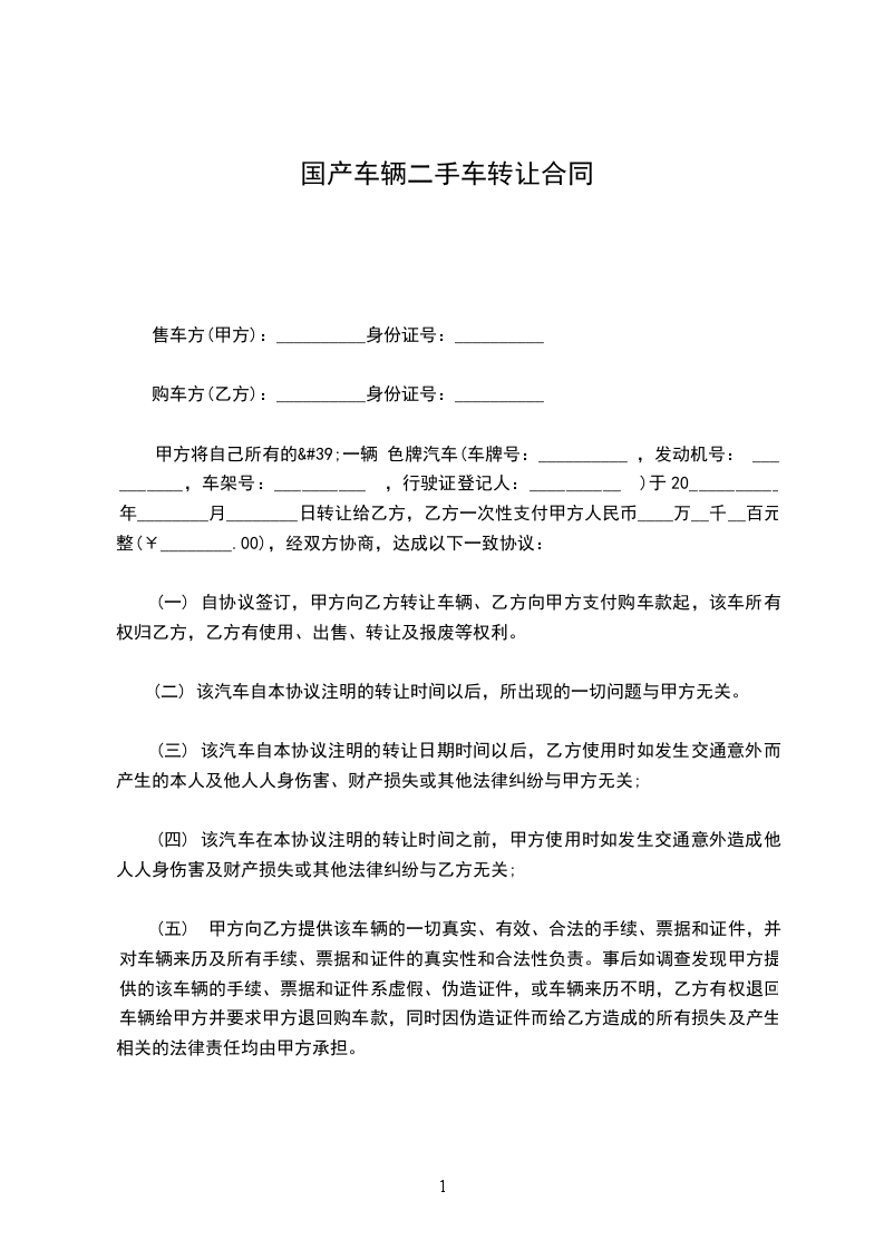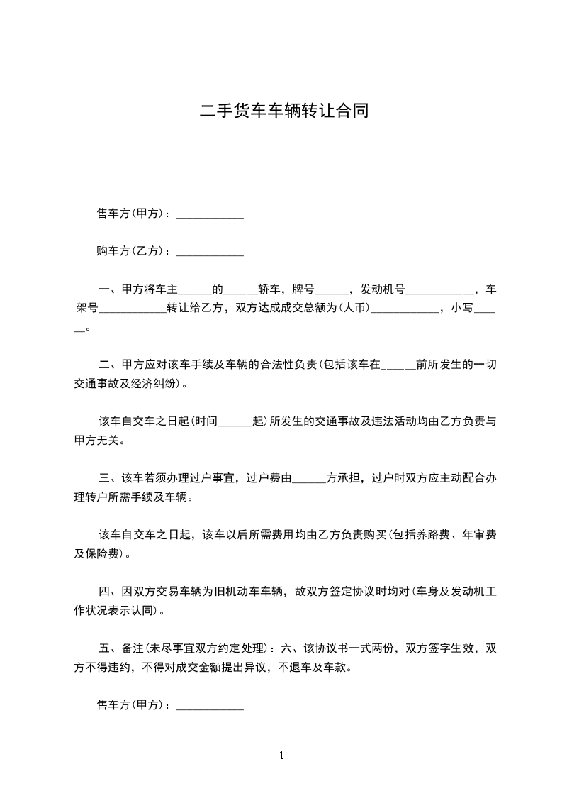 甲方_________现将___________车转让 乙方_________。该车车牌号为码为_________,发动机号为______________,车架号为______________________。现订立汽车转让合同如下