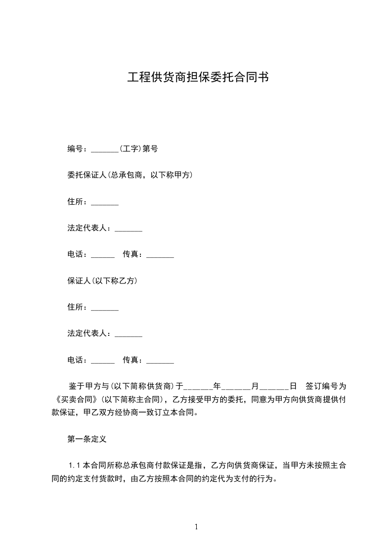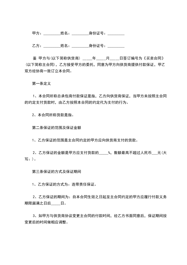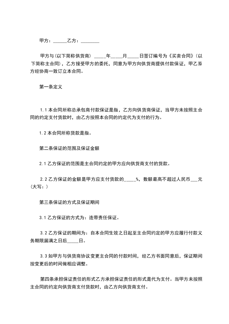 1、本合同所称总承包商付款保证是指,乙方向供货商保证,当甲方未按照主合同的约定支付货款时,由乙方按照本合同的约定代为支付的行为。
