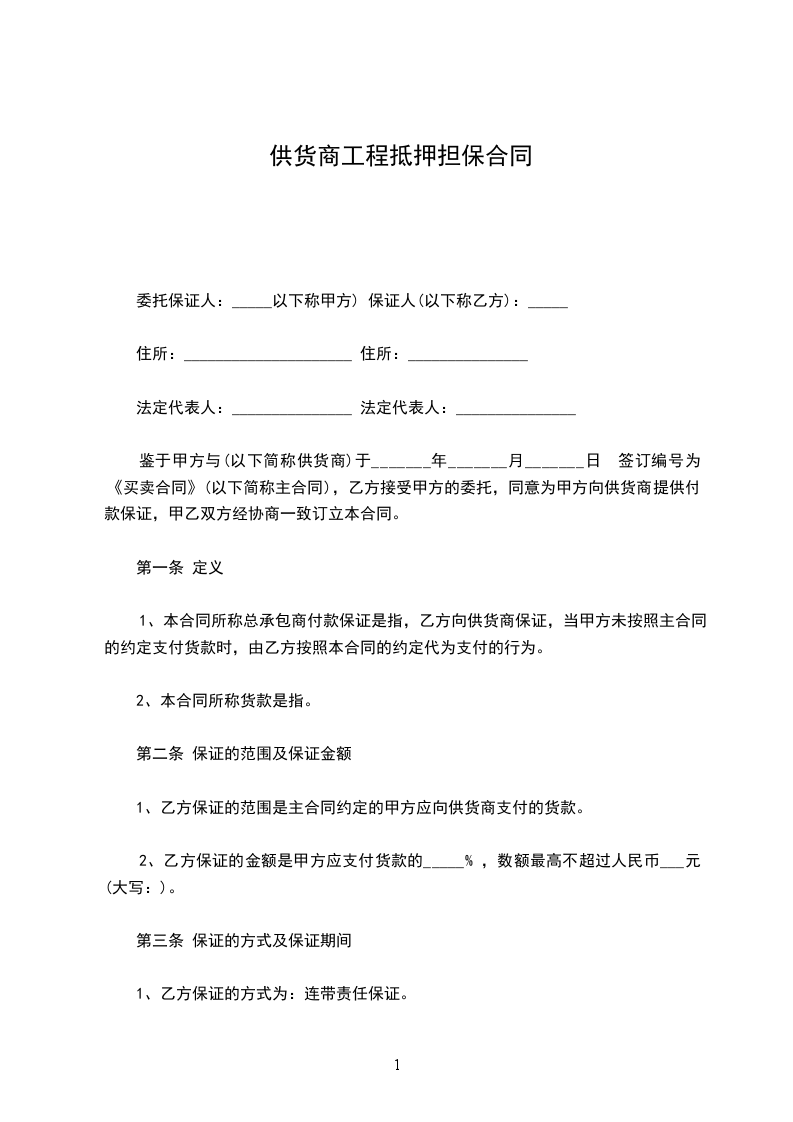 1、乙方在甲乙双方签订本合同,并收到甲方支付的担保费之日起_____日内,向供货商出具《总承包商付款(供货)保函》。