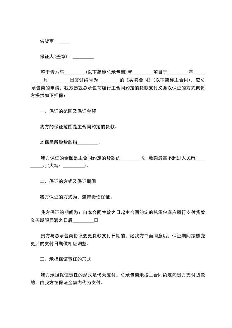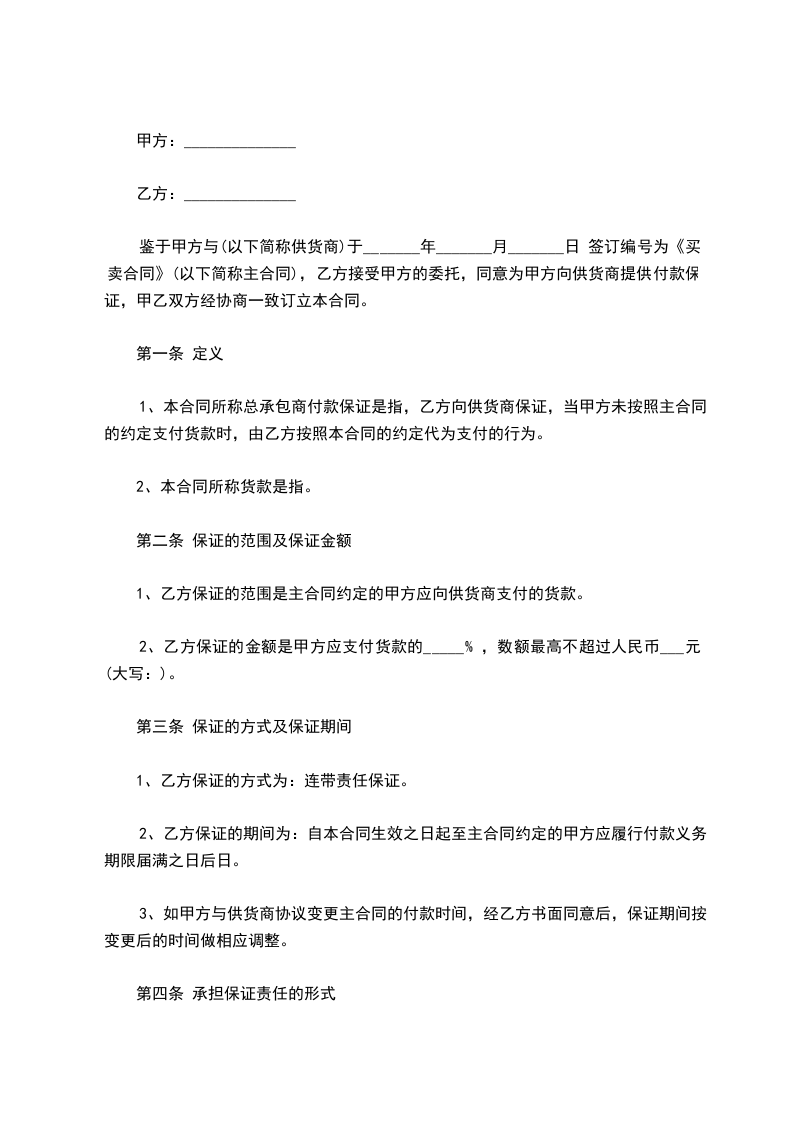 第四条承担保证责任的形式乙方承担保证责任的形式是代为支付。当甲方未按照主合同的约定向供货商支付货款时,由乙方向供货商支付。
