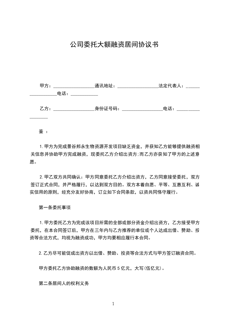 2.甲乙双方共同确认:甲方同意委托乙方介绍出资方,乙方同意接受委托,双方签订正式合同,并严格履行,以达到双方目的。双方本着自愿、平等、互惠互利、诚实信用的原则,经充分友好协商,订立如下合同条款,以资共同恪守履行。