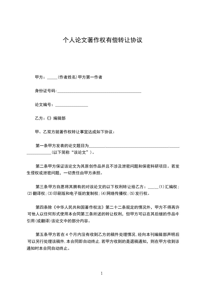 第三条甲方自愿将其拥有的对该论文的以下权利转让给乙方:_____(1)汇编权;(2)翻译权;(3)印刷版和电子版的复制权;(4)网络传播权;(5)发行权。