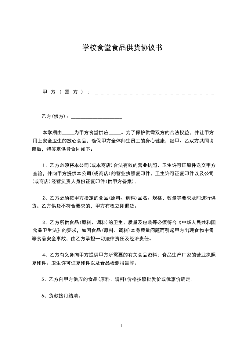 1、甲方所供食品,必须符合食品标准,如出现食品卫生质量问题,乙方无条件退货或换货。
