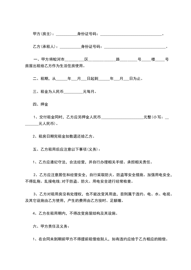 一、甲方将_______市__________区_______路_________号_____楼_____号房屋出租给乙方作为生活住房使用。
