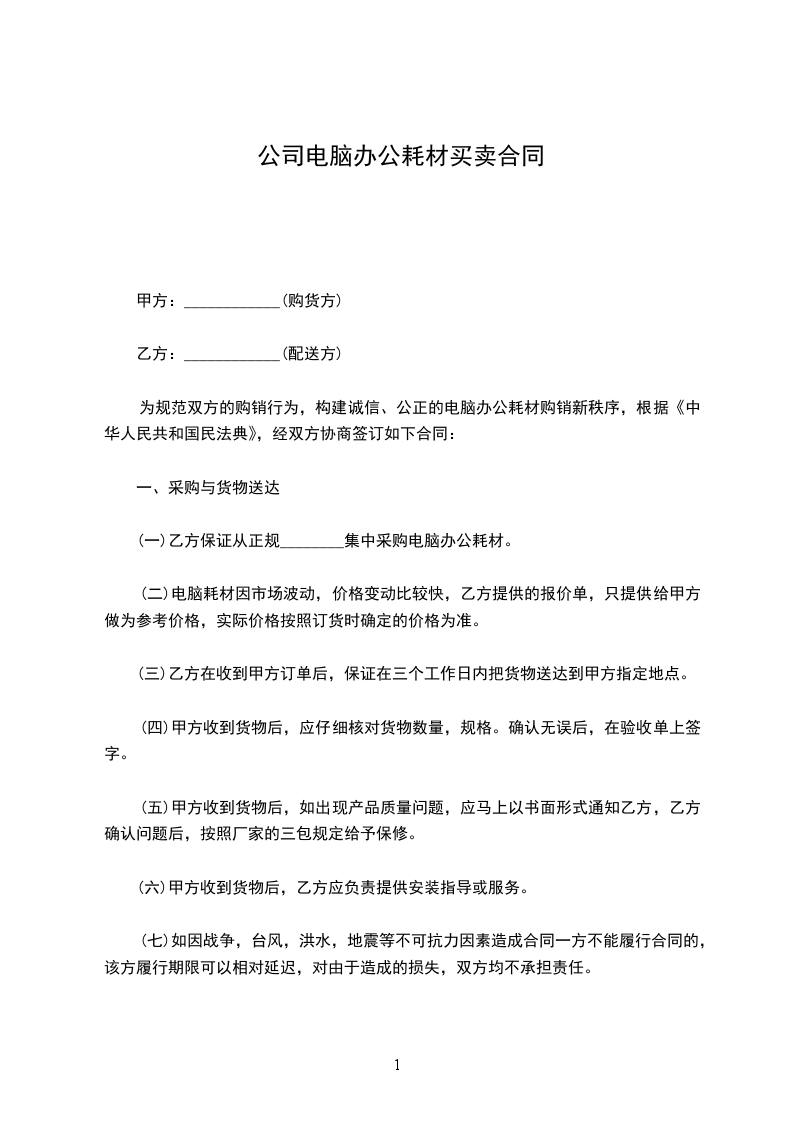 为规范双方的购销行为,构建诚信、公正的电脑办公耗材购销秩序,根据《中华人民共和国民法典》,经双方协商签订如下合同: