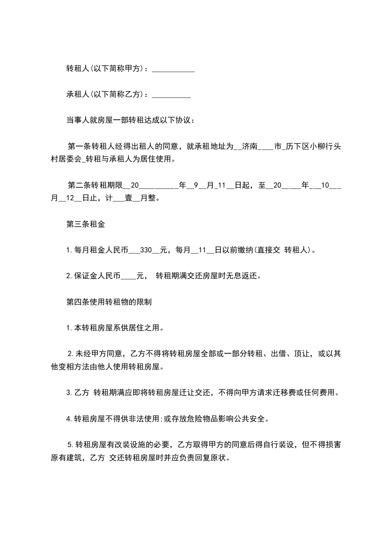 第一条转租人经得出租人的同意,就承租地址为__济南____市_历下区小柳行头村居委会_转租与承租人为居住使用。