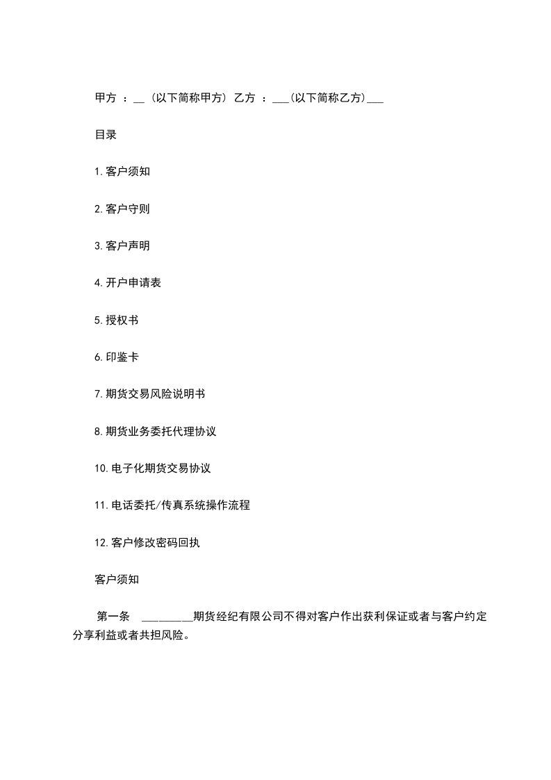 第一条 _________期货经纪有限公司不得对客户作出获利保证或者与客户约定分享利益或者共担风险。