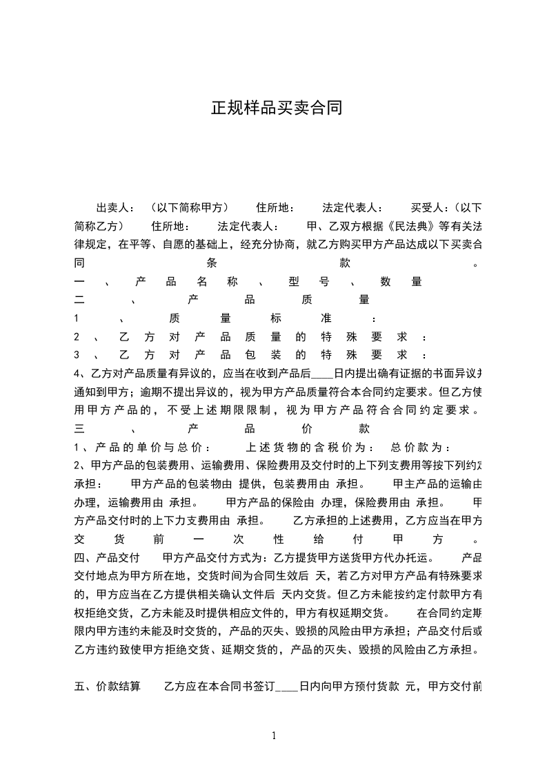 出卖人: (以下简称甲方) 住所地: 法定代表人: 买受人:(以下简称乙方) 住所地: 法定代表人: 甲、乙双方根据《民法典》等有关法律规定,在平等、自愿的基础上,经充分协商,就乙方购买甲方产品达成以下买卖合同条款。