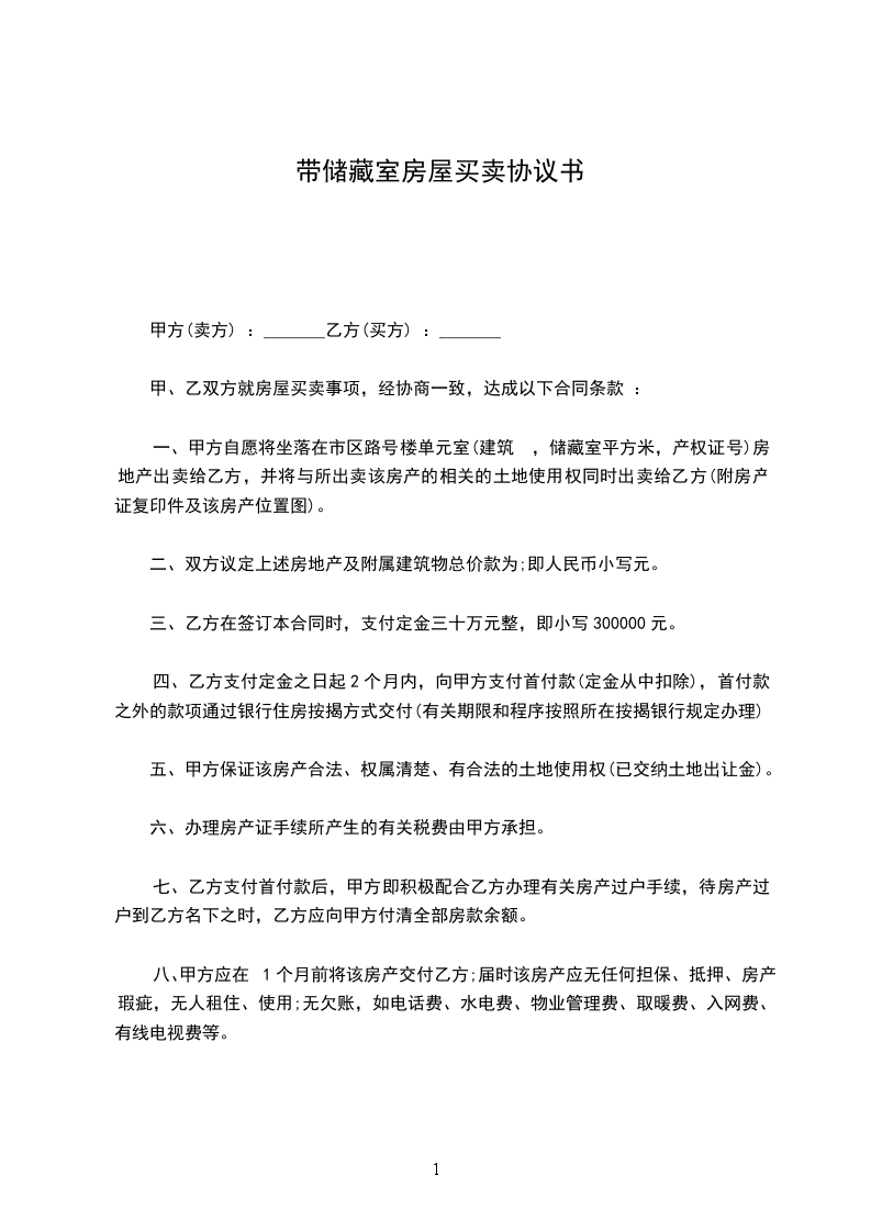 一、甲方自愿将坐落在 市 区 路 小区 号楼 单元 室(建筑面积 平方米,储藏室 平方米,产权证号 )房地产出卖给乙方,并将与所出卖该房产的相关的土地使用权同时出卖给乙方(附房产证复印件及该房产位置图)。