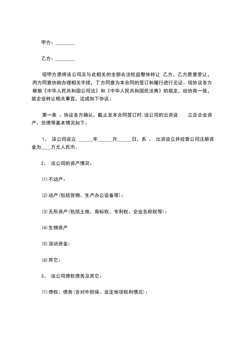 现甲方愿将该公司及与此相关的全部合法权益整体转让 乙方,乙方愿意受让,丙方同意协助办理相关手续,丁方同意为本合同的签订和履行进行见证。现协议各方根据《中华人民共和国公司法》和《中华人民共和国民法典》的规定,经协商一致,就企业转让相关事宜,达成如下协议: