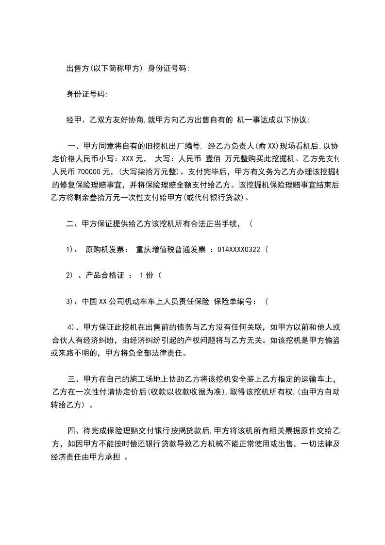 一、甲方同意将自有的旧挖机出厂编号, 经乙方负责人(俞XX)现场看机后,以协定价格人民币小写:XXX元, 大写:人民币 壹佰 万元整购买此挖掘机。乙方先支付人民币700000元,(大写柒拾万元整)。支付完毕后,甲方有义务为乙方办理该挖掘机的修复保险理赔事宜,并将保险理赔全额支付给乙方。该挖掘机保险理赔事宜结束后,乙方将剩余叁拾万元一次性支付给甲方(或代付银行贷款)。