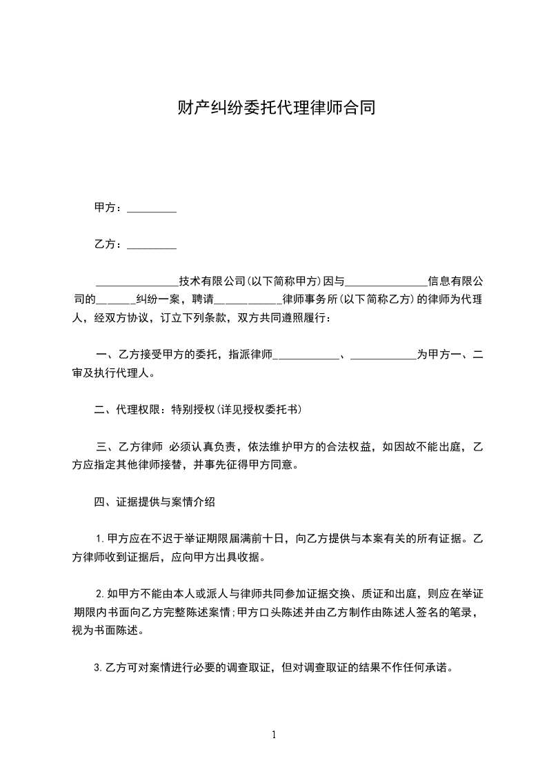 _______________技术有限公司(以下简称甲方)因与_______________信息有限公司的_______纠纷一案,聘请____________律师事务所(以下简称乙方)的律师为代理人,经双方协议,订立下列条款,双方共同遵照履行:
