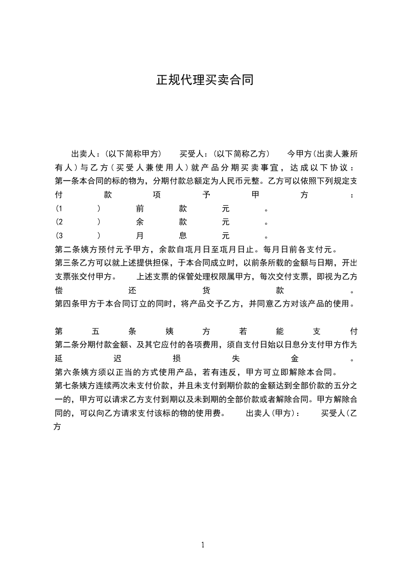 出卖人:(以下简称甲方) 买受人:(以下简称乙方) 今甲方(出卖人兼所有人)与乙方(买受人兼使用人)就产品分期买卖事宜,达成以下协议: