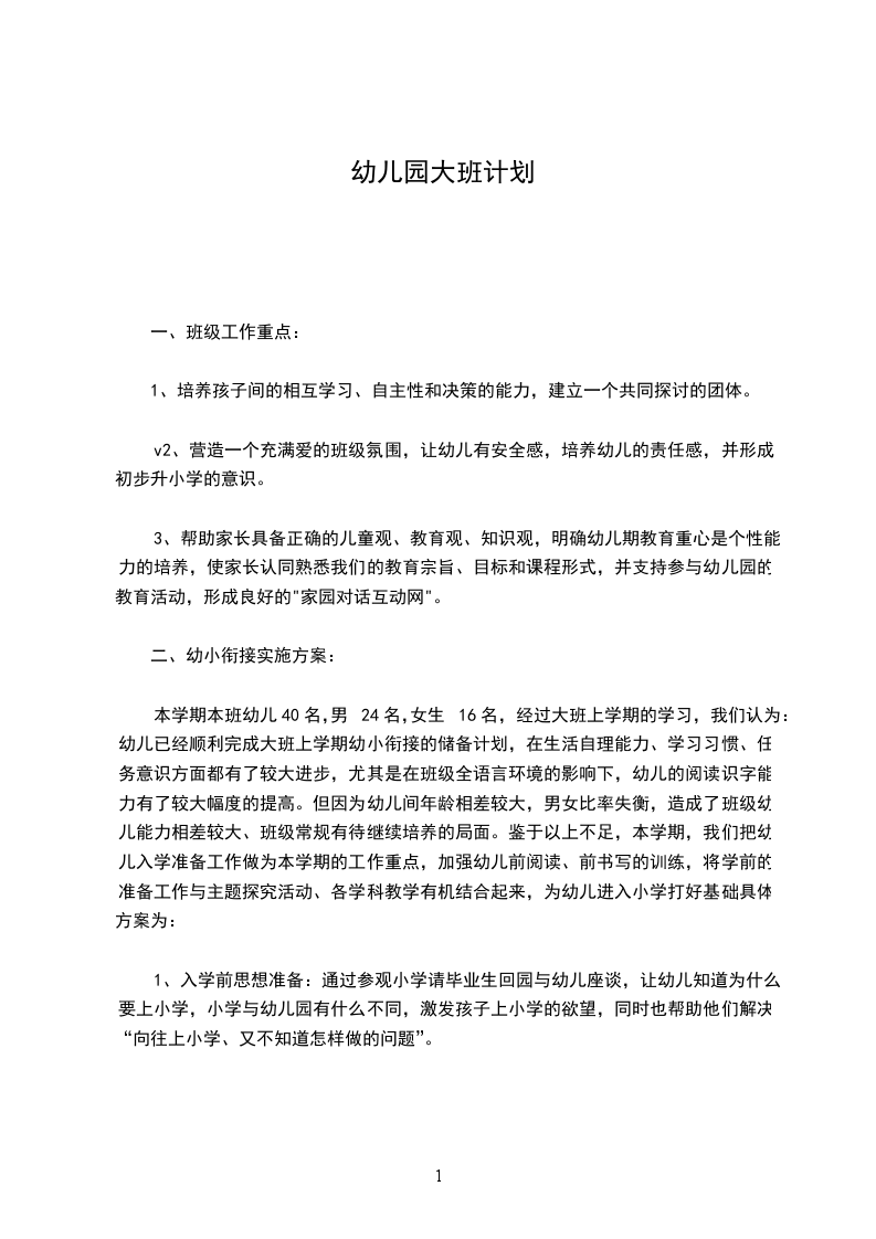 本学期本班幼儿40名,男24名,女生16名,经过大班上学期的学习,我们认为:幼儿已经顺利完成大班上学期幼小衔接的储备计划,在生活自理能力、学习习惯、任务意识方面都有了较大进步,尤其是在班级全语言环境的影响下,幼儿的阅读识字能力有了较大幅度的提高。但因为幼儿间年龄相差较大,男女比率失衡,造成了班级幼儿能力相差较大、班级常规有待继续培养的局面。鉴于以上不足,本学期,我们把幼儿入学准备工作做为本学期的工作重点,加强幼儿前阅读、前书写的训练,将学前的准备工作与主题探究活动、各学科教学有机结合起来,为幼儿进入小学打好基础具体方案为: