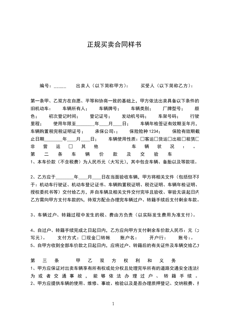 第一条甲、乙双方在自愿、平等和协商一致的基础上,甲方依法出卖具备以下条件的旧机动车: 车辆所有人; 车辆牌号; 车辆类别; 厂牌型号; 颜色; 初次登记时间; 登记证号; 发动机号码; 车架号码; 行驶里程; 使用年限至________年____月____日; 车辆年检签证有效期至年月,车辆购置税完税证明证号; 承保公司:; 保险险种1234; 保险有效期截止日期________年____月____日; 车辆使用性质:□客运□货运□出租□租赁□非营运□其他 车辆状况:。