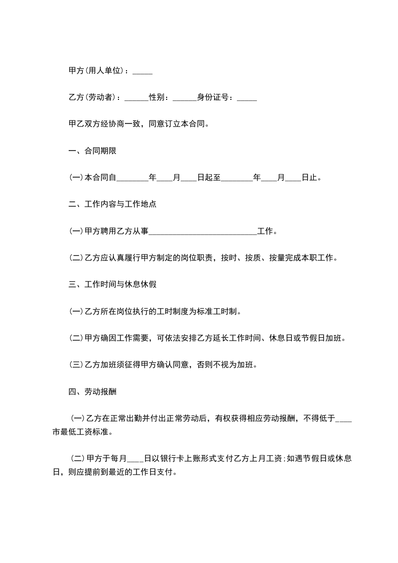 (一)乙方在正常出勤并付出正常劳动后,有权获得相应劳动报酬,不得低于____市最低工资标准。