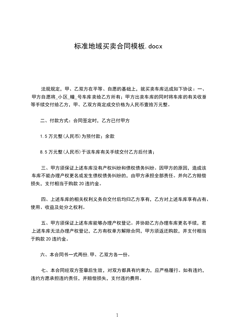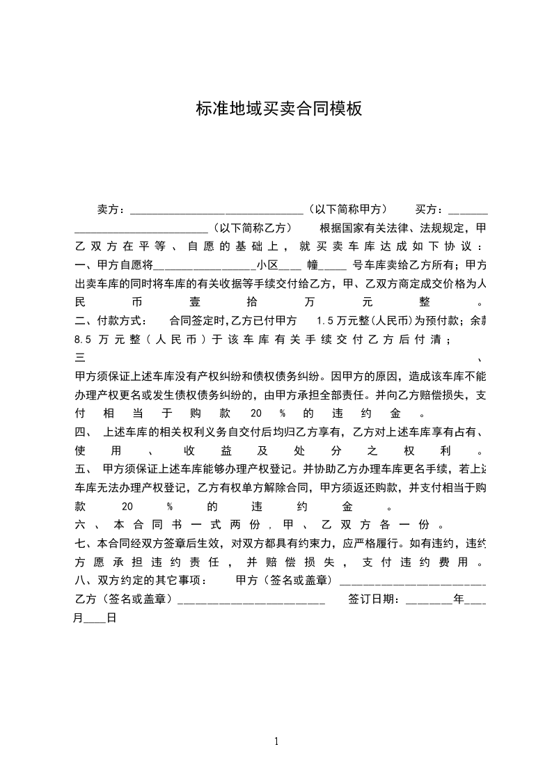 一、甲方自愿将__________________小区____ 幢_____ 号车库卖给乙方所有;甲方出卖车库的同时将车库的有关收据等手续交付给乙方,甲、乙双方商定成交价格为人民币壹拾万元整。
