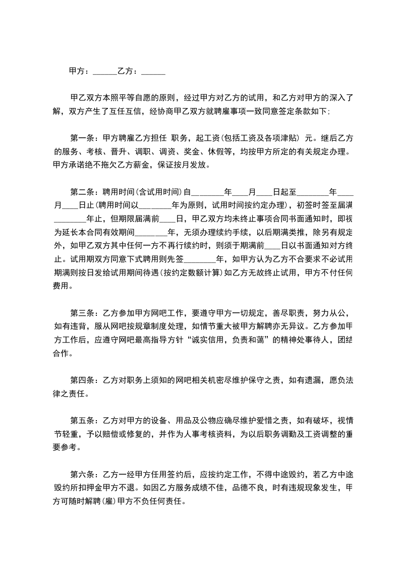 第三条:乙方参加甲方网吧工作,要遵守甲方一切规定,善尽职责,努力从公,如有违背,服从网吧按规章制度处理,如情节重大被甲方解聘亦无异议。乙方参加甲方工作后,应遵守网吧最高指导方针“诚实信用,负责和蔼”的精神处事待人,团结合作。