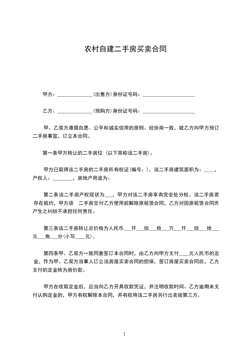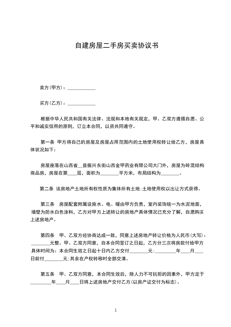 一、甲方将其自建房屋(建筑面积_____平方米,位于第_____层_____套)以总价______出售给乙方。乙方自愿以上述价格向甲方认购该房屋。