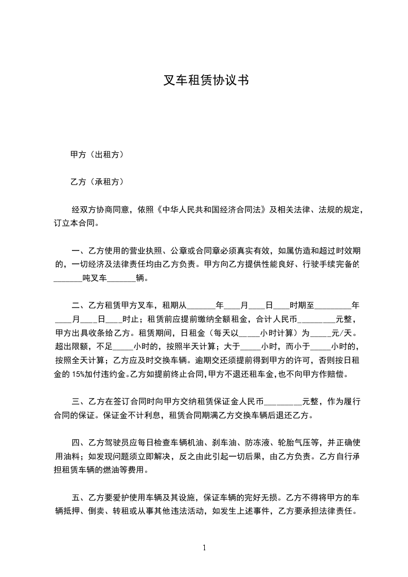 一、乙方使用的营业执照、公章或合同章必须真实有效,如属仿造和超过时效期的,一切经济及法律责任均由乙方负责。甲方向乙方提供性能良好、行驶手续完备的_______吨叉车_______辆。