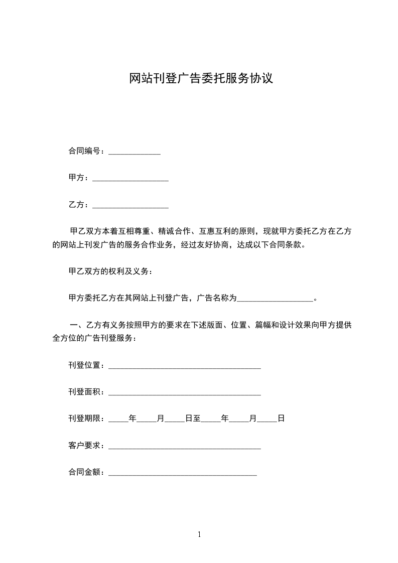 甲乙双方本着互相尊重、精诚合作、互惠互利的原则,现就甲方委托乙方在乙方的网站上刊发广告的服务合作业务,经过友好协商,达成以下合同条款。