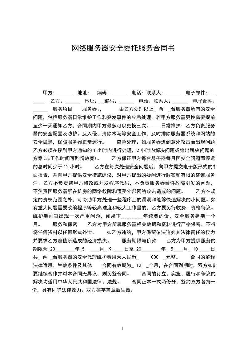 甲方:______ 地址:__编码:______ 电话:联系人:______ 电子邮件::______ 乙方:______ 地址:__编码:______ 电话:联系人:______ 电子邮件::______ 服务项目 服务器:, 由乙方处理以上_ 两 _台服务器所有的安全问题,包括服务器日常维护工作和突发事件的应急处理。若甲方服务器更换需要提前至少一天通知乙方,合同期内甲方最多可以更换三次。____日常维护:乙方负责服务器的安全配置及防护、反入侵、清除木马等安全工作,及时排除服务器系统和网站的安全隐患,保障服务器正常运行。 应急处理:如服务器遭到意外攻击而出现问题,乙方必须在接到甲方通知的1小时内进行处理,2小时内解决问题或给出解决问题的方案(非工作时间可酌情放宽)。 乙方保证甲方每台服务器每月因安全问题而停运的总时间少于12小时。 乙方在每次处理安全问题后,向甲方提交电子版形式的书面报告,并向甲方提供安全措施建议,对甲方提出的疑问进行解答和有限的咨询服务。 注:乙方不负责帮甲方修改或开发程序代码,不负责服务器硬件故障引发的问题,不负责因服务器所在机房的网络故障和遭受外部网络攻击造成的问题。 乙方在规定的责权范围之外,可协助甲方处理一些程序上的漏洞和能够快速解决的小问题。如有重大问题需要改编程序等较高难度和较大工作量的,乙方要另行收费,价格待议。 维护期间每出现一次严重问题,如果下________年续费的话,安全服务延期一个月。 服务和保密 乙方对甲方所属服务器相关数据和资料进行严格保密,不得将任何资料以任何形式外泄。 如乙方违约,甲方保留依法追究其法律责任的权力,并要求乙方赔偿所造成的经济损失。 服务期限与价款 乙方为甲方提供服务的期限为_20________年_5 ____月_ 9 ____日至_20________年_ 5____月_ 10 ____日。 共_ 两 _台服务器的安全代理维护费用为人民币_ 000 _元整。 合同的解释、法律适用、生效条件及其他 合同有效期为_ 12 _个月,在合同到期时,双方如需要继续合作并对本合同无异议,则另签合同。 合同的订立、实施、履行和争议的解决均适用中华人民共和国法律、法规。 合同正本一式两份分,签约双方各持一份,具有同等法律效力。双方签字盖章后生效。