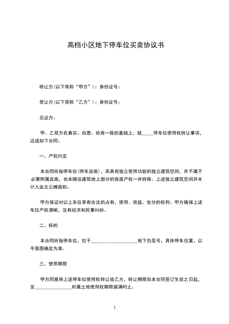 甲方同意将上述停车位使用权转让给乙方,转让期限自本合同签订生效之日起,至________________所属土地使用权期限届满时止。