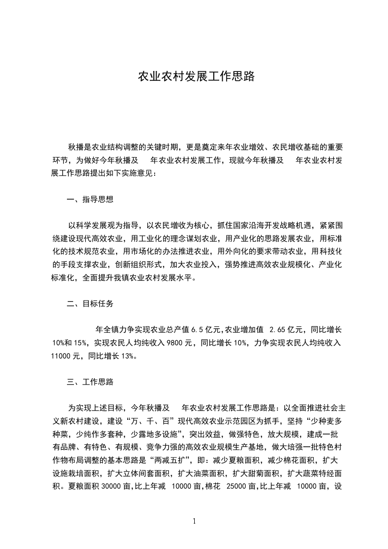 以科学发展观为指导,以农民增收为核心,抓住国家沿海开发战略机遇,紧紧围绕建设现代高效农业,用工业化的理念谋划农业,用产业化的思路发展农业,用标准化的技术规范农业,用市场化的办法推进农业,用外向化的要求带动农业,用科技化的手段支撑农业,创新组织形式,加大农业投入,强势推进高效农业规模化、产业化、标准化,全面提升我镇农业农村发展水平。