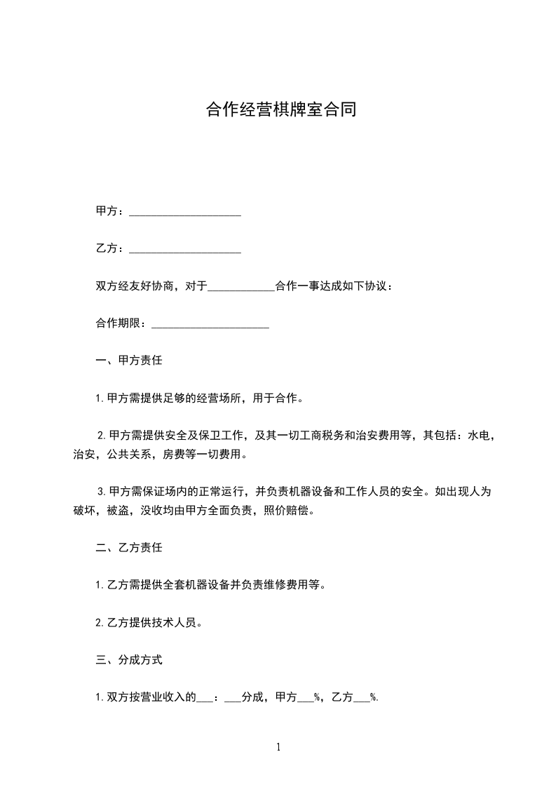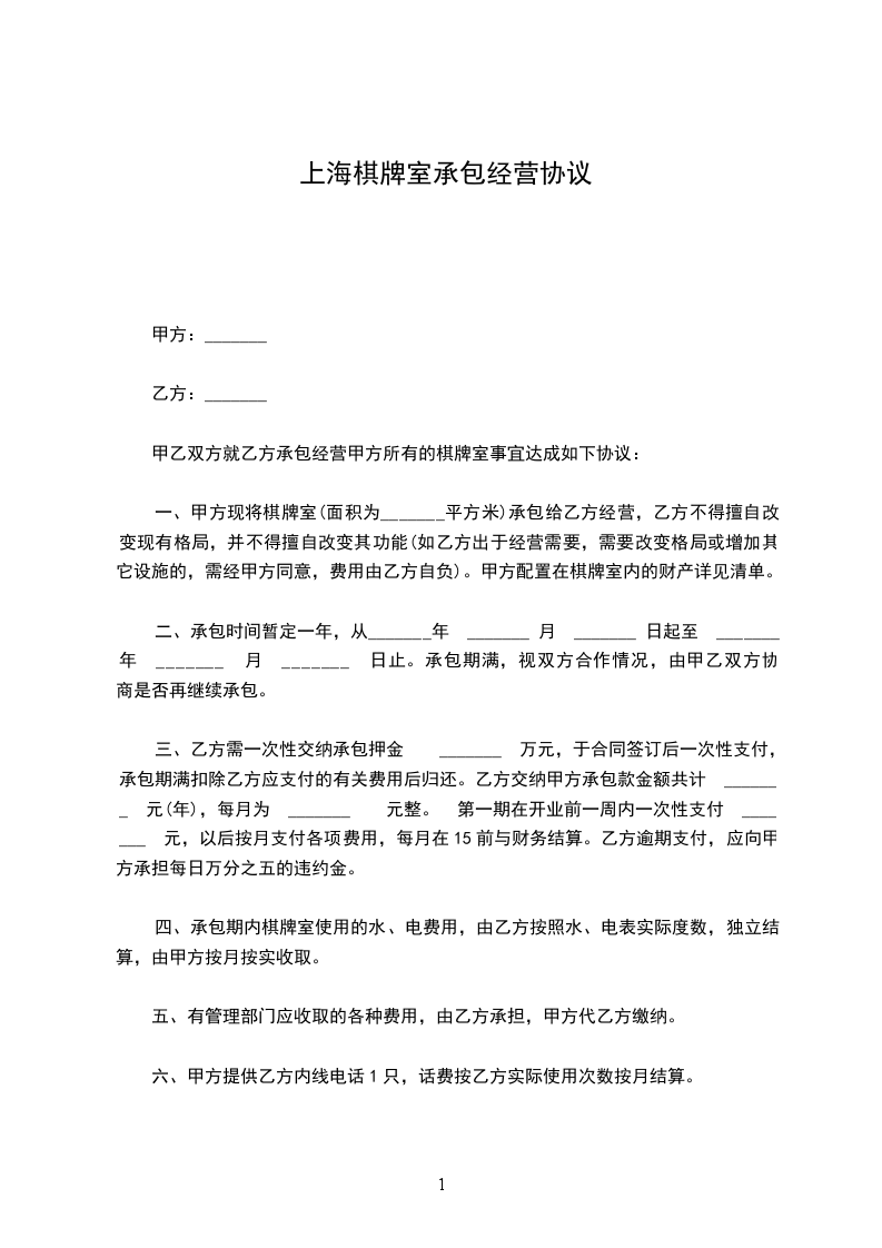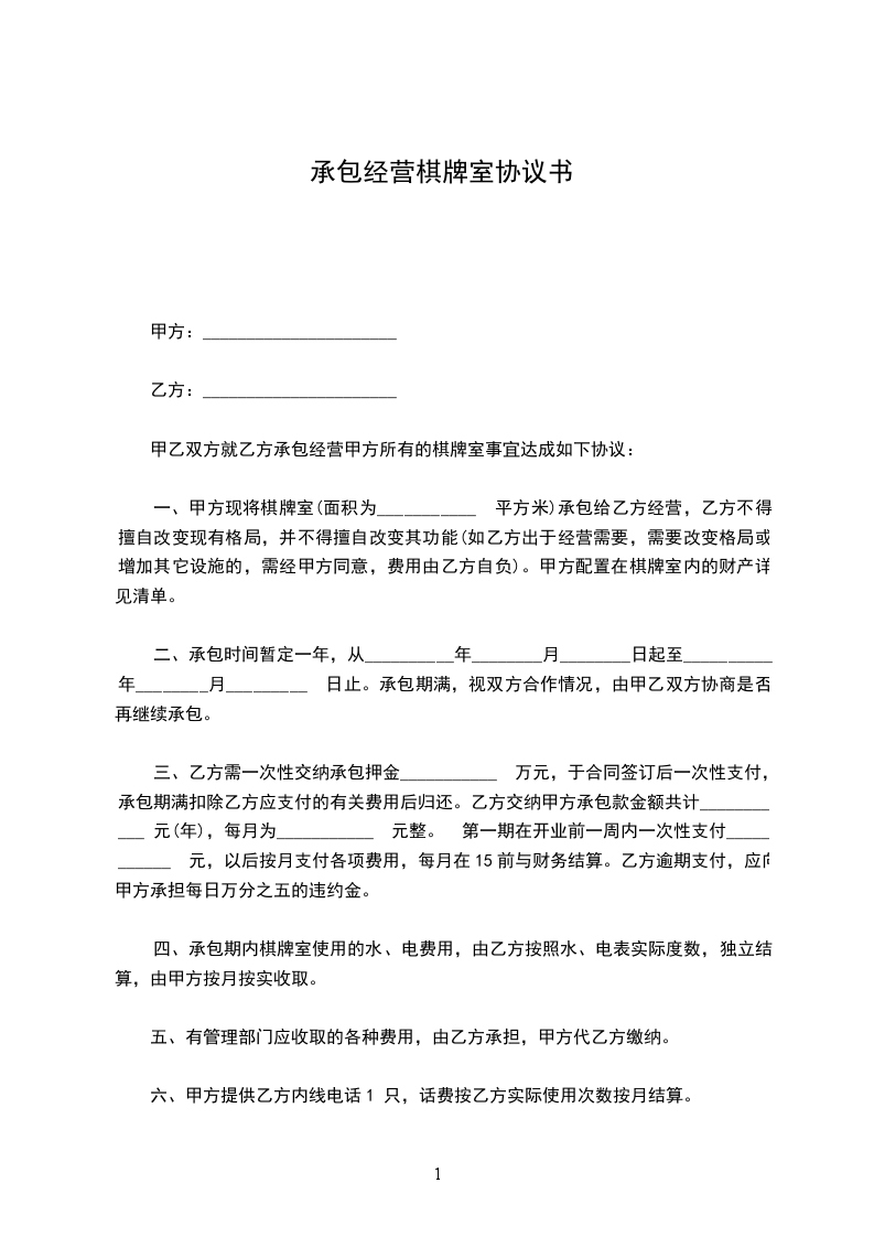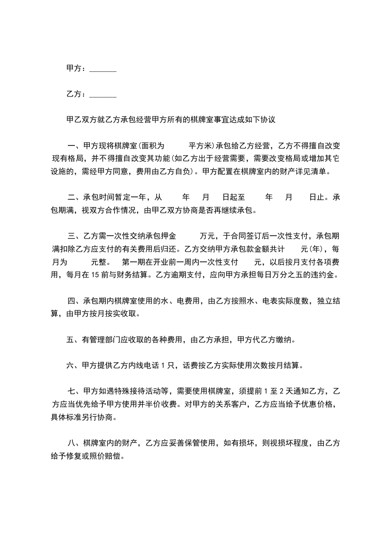 一、甲方现将棋牌室(面积为_______平方米)承包给乙方经营,乙方不得擅自改变现有格局,并不得擅自改变其功能(如乙方出于经营需要,需要改变格局或增加其它设施的,需经甲方同意,费用由乙方自负)。甲方配置在棋牌室内的财产详见清单。