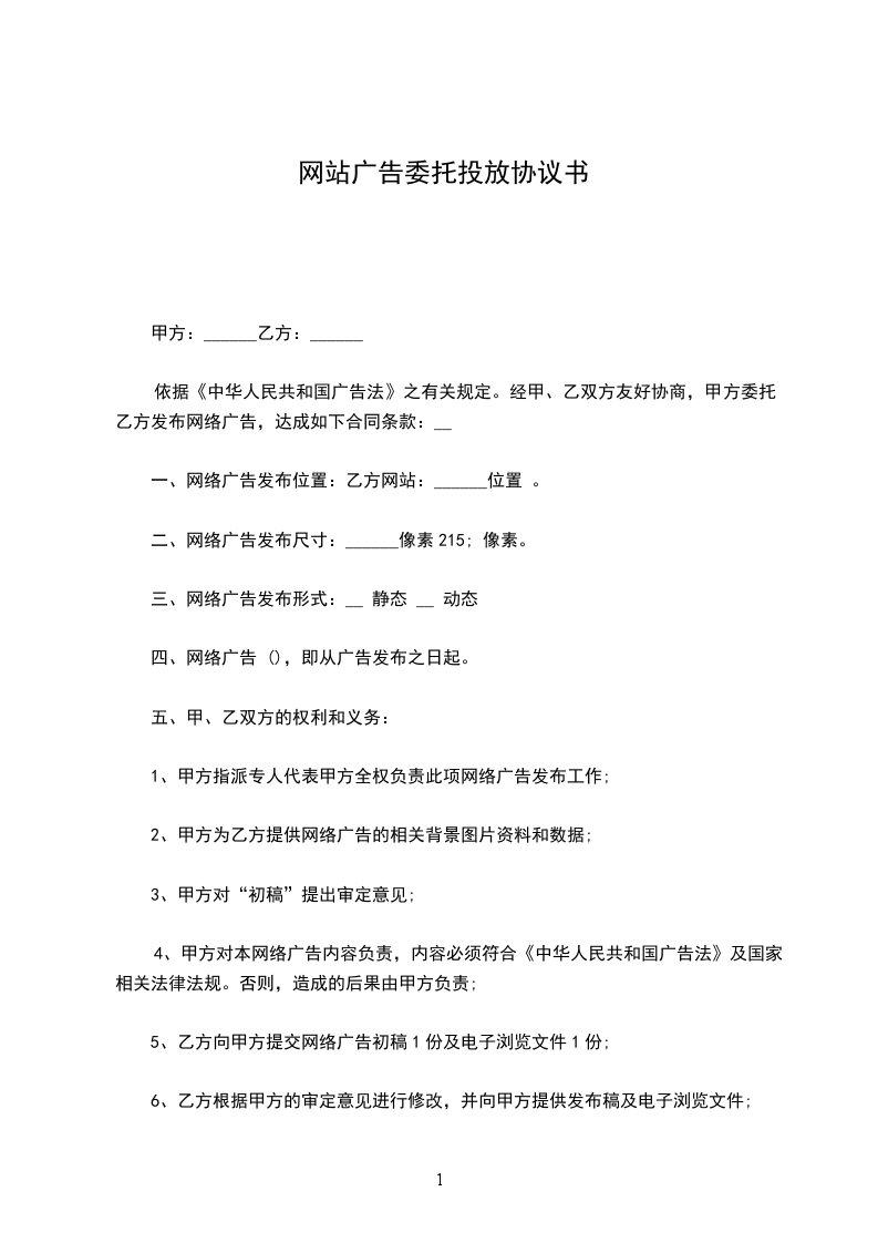 依据《中华人民共和国广告法》之有关规定。经甲、乙双方友好协商,甲方委托乙方发布网络广告,达成如下合同条款:__