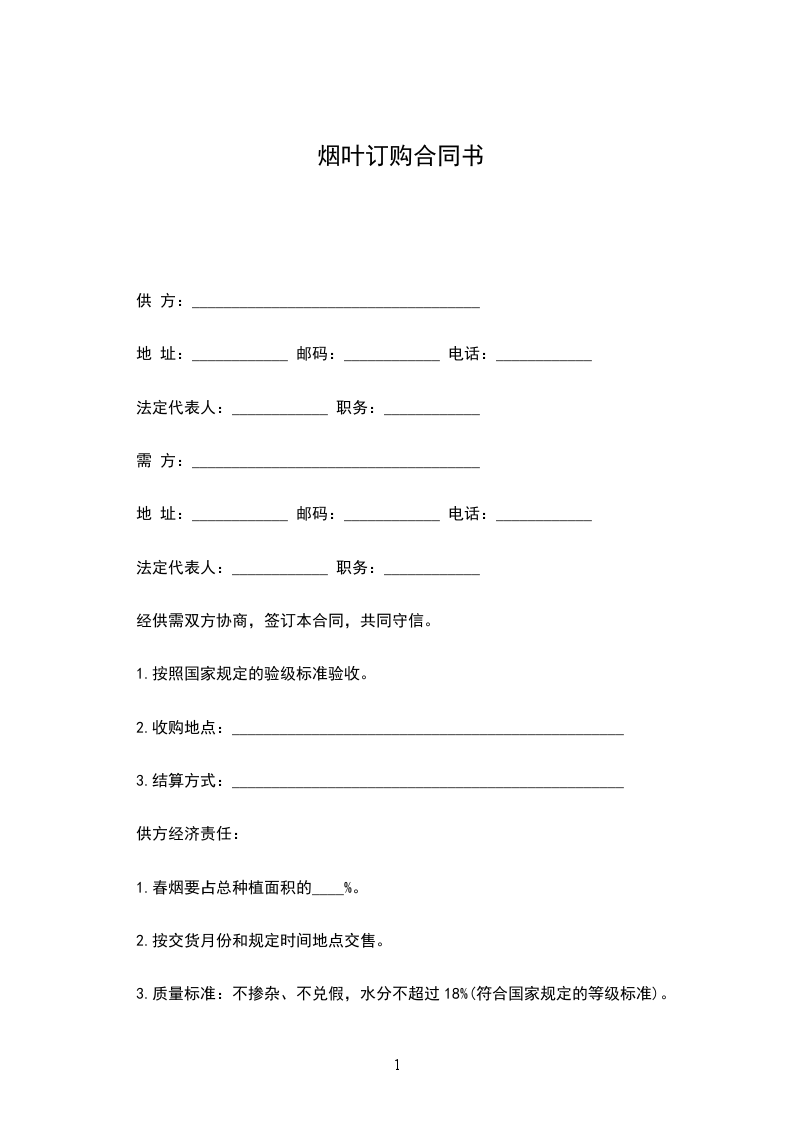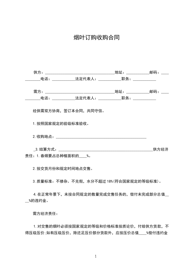 2、在烟叶收购时,约时定点并做到随到随收,不得无故拖延时间,如不按合同规定时间、数量收购,偿付收购不足部分总值____%的违约金。