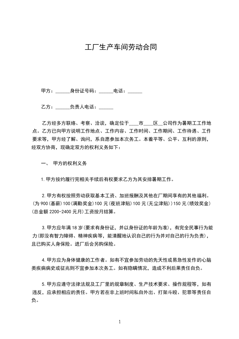 5.甲方应遵守法律法规及工厂里的规章制度、生产技术要求、操作规程等,如有违反,应承担相应的责任。甲方若在非上班时间私自外出、打架斗殴、犯罪等责任自负。