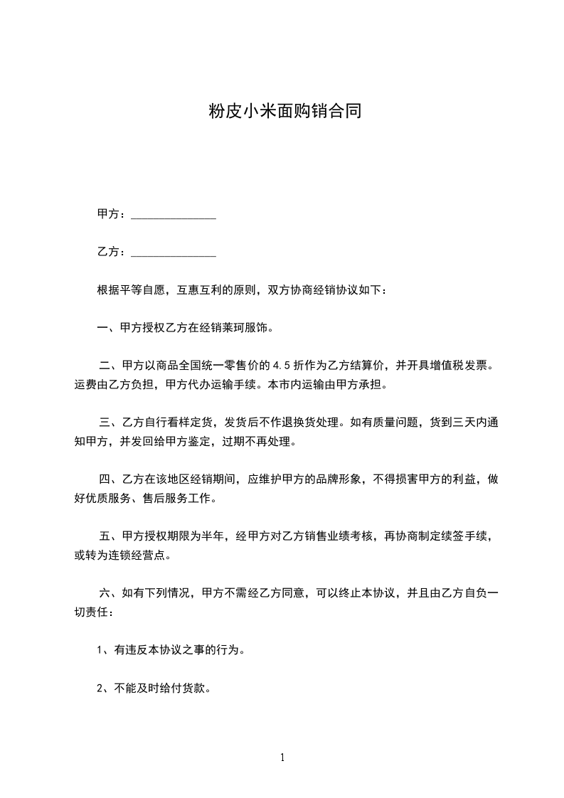 四、甲方必须做到及时收购,保证不借故压车、退车,做到认真执行国家质价政策,保证不压等压价。对乙方交售的粮食,结算形式不限,现金、转账由本人任选。除农业税外,不代任何部门扣款,不打白条。